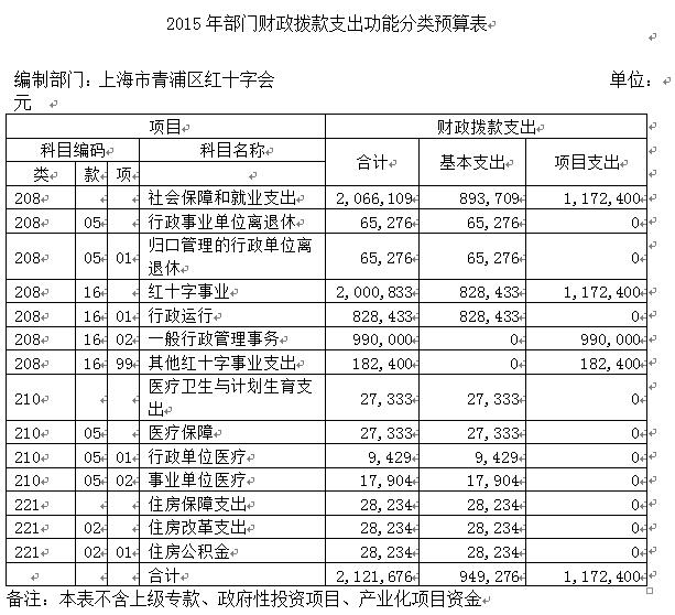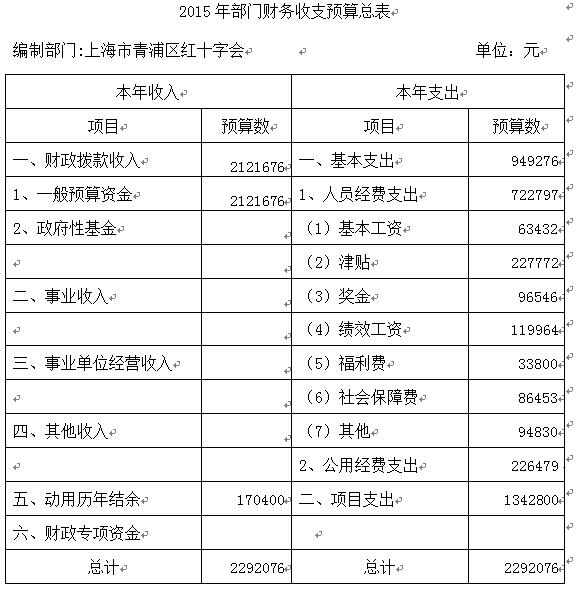 上海市青浦区红十字会是从事人道主义工作的社会救助团体,其主要职责包括备灾救灾、赈济救护、人道救助、社区服务、红十字知识普及、群众性现场初级急救培训、红十字青少年培养、少儿住院互助基金、造血干细胞捐献、遗体(角膜)捐献、器官捐献宣传发动等工作。 上海市青浦区红十字会部门预算是包括上海市青浦区红十字会本部以及下属事业单位的综合收支计划。2015年,青浦区红十字会部门预算支出总额为229.21万元,其中:财政拨款支出预算229.21万元。财政拨款支出预算中,基本支出94.93万元、项目支出134.28万元。